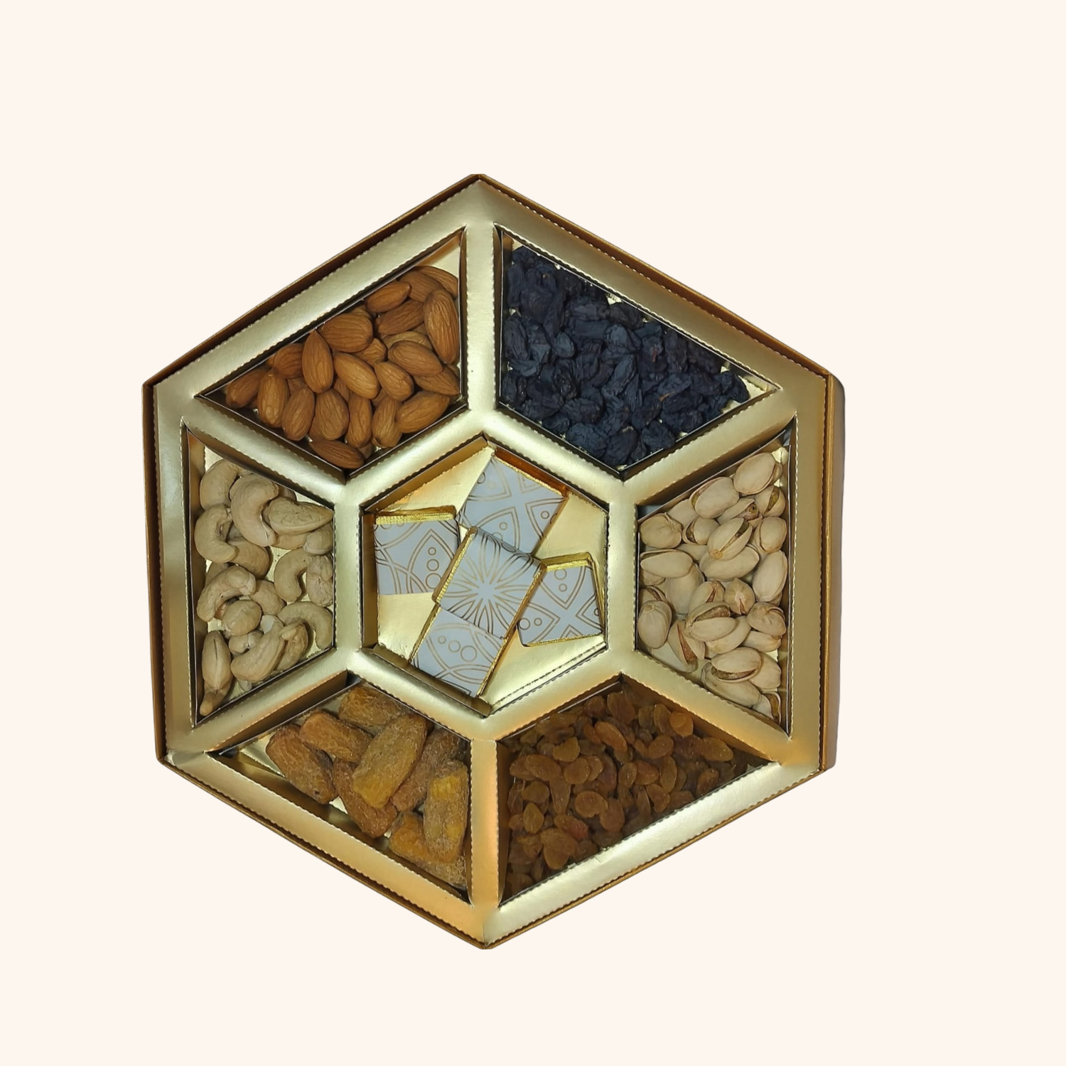Contains: Almonds, Cashews, Pistachios, Dates, Assorted chocolates, black and yellow Raisins. Approx. Weight: 350g