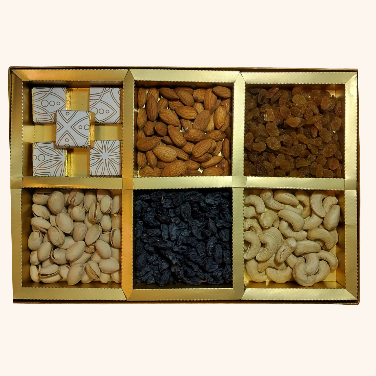 Contains: Almonds, Cashews, Yellow Raisins, Black Raisins, Pistachios & Assorted Chocolates. Approx. Weight: 400g